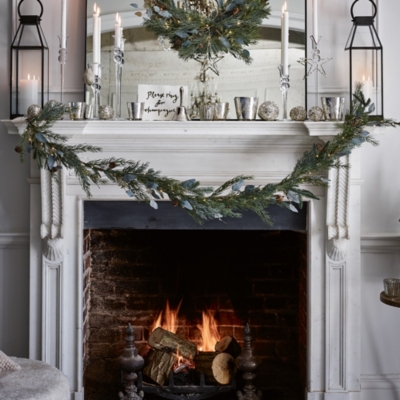 Densely filled with layers of artificial pine tree branches and detailed with frosted winter berries and genuine pine cones that are finished with a white frosted effect it looks classically christmassy. We love draping it over the mantelpiece or using it to create a stunning centrepiece. Our most glamorous garland offering this is made from a selection of intertwined silver and champagne coloured foliage and branches some of which have been hand beaded and flecked with snow white buds and dotted with sparkling ferns.